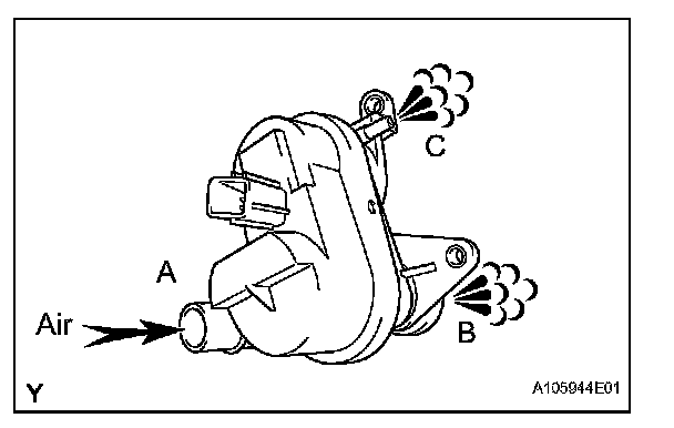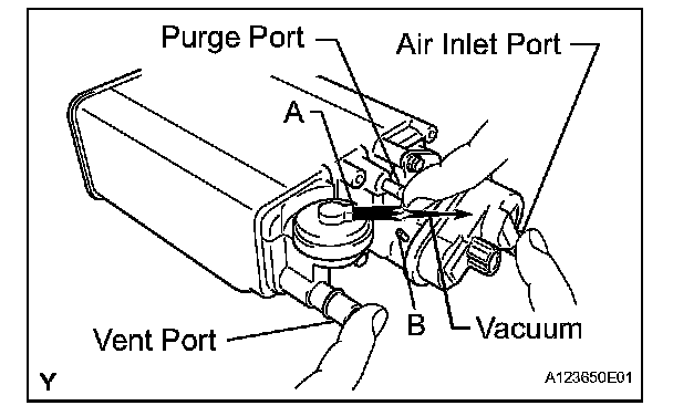 2. While holding the vent, purge and air inlet ports closed, apply vacuum at 1.42 kPa (14.5 kgf/ sq.cm, 10.6 mmHg) into port A, and check that air is not sucked into port B.