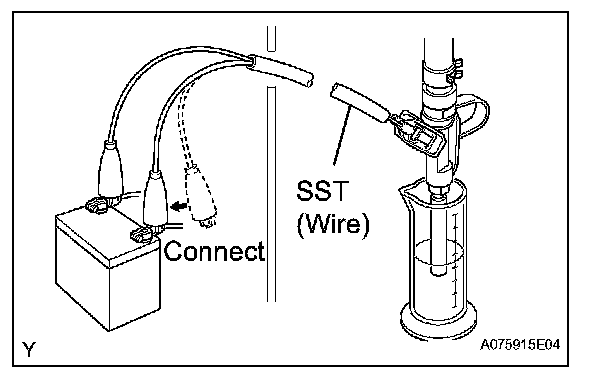 6. Connect SST (wire) to the injector assembly and the battery for 15 seconds, and measure the injection volume with the graduated cylinder. Test each injector 2 or 3 times. SST 09842-30080