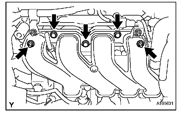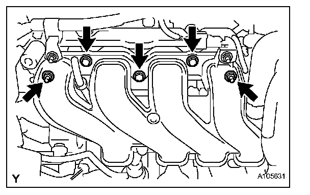 e. Remove the 3 bolts and 2 nuts and remove the intake manifold.