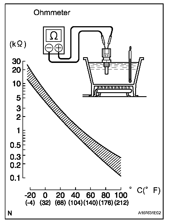 NOTE: When checking the engine coolant temperature sensor in water, keep the terminals dry. After the check, wipe the sensor dry.
