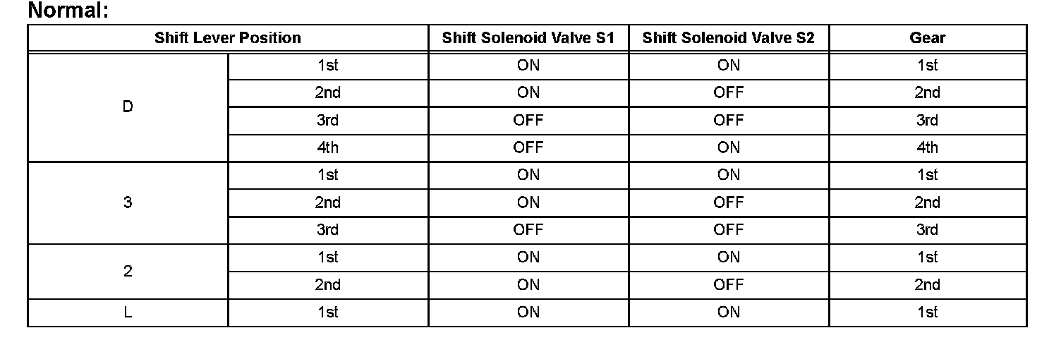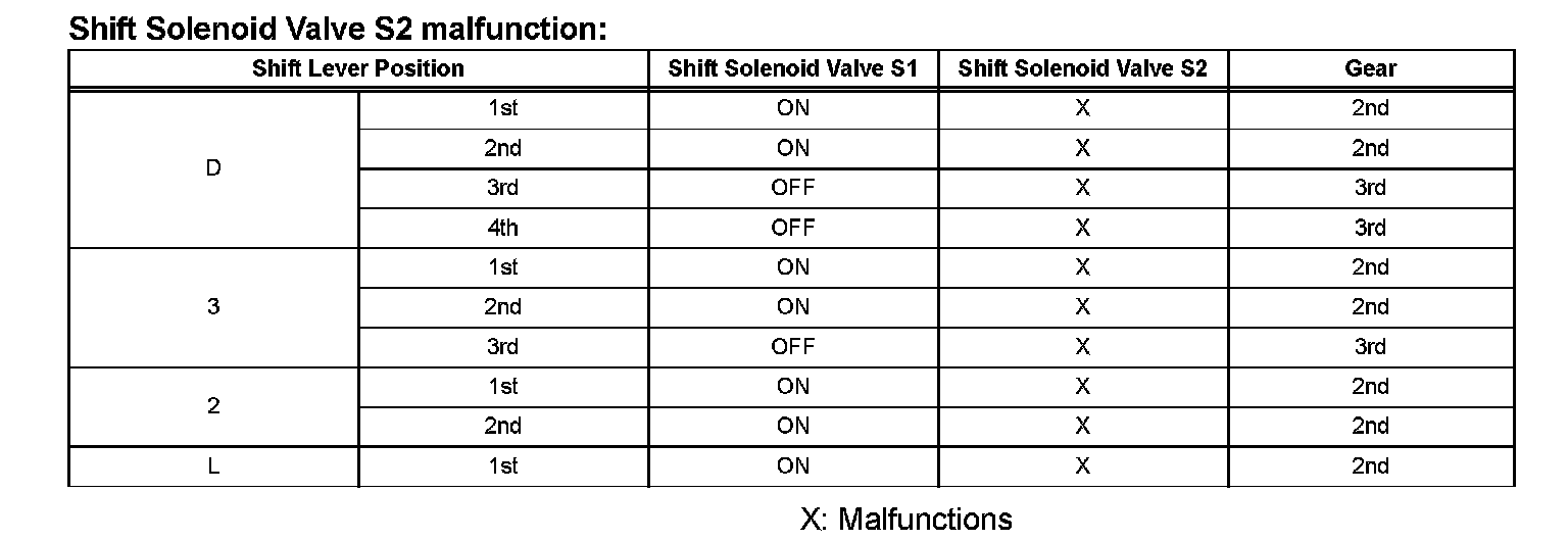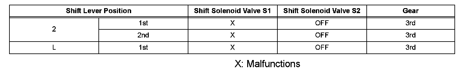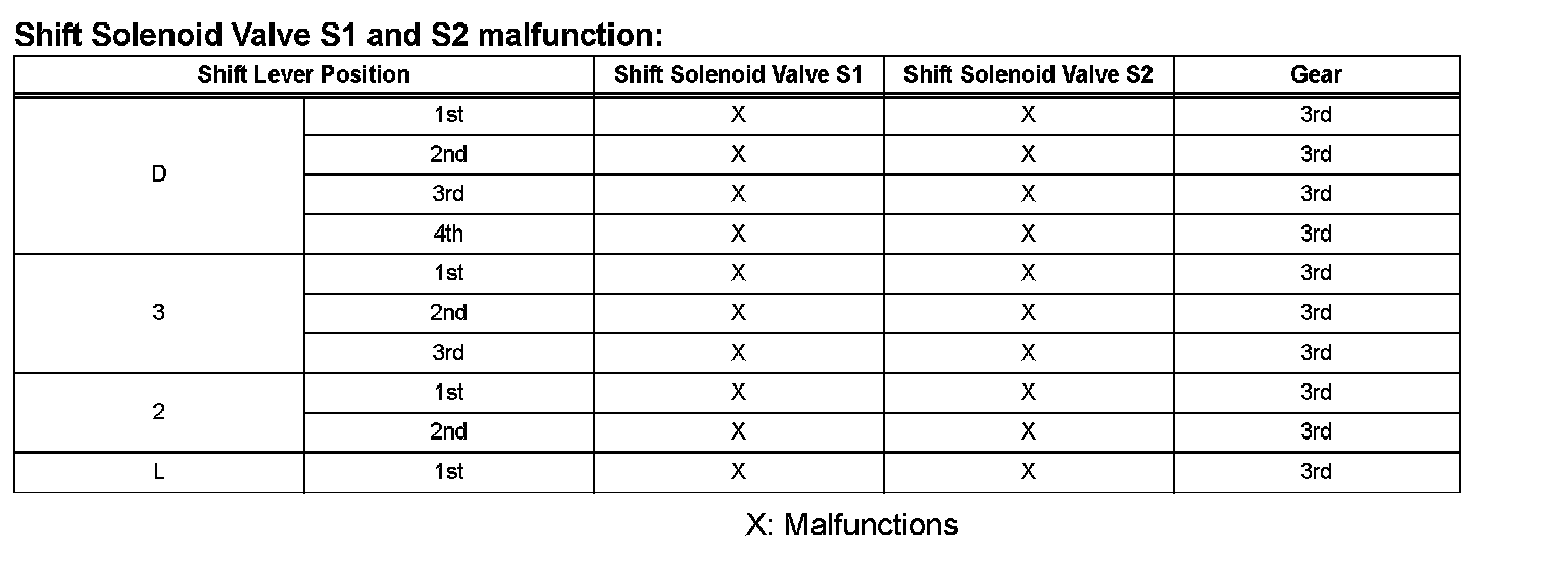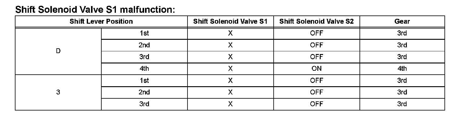 If either of the shift solenoid valve circuits develops an open or short, the ECM turns the other shift solenoid ON or OFF in order to shift into the gear positions shown in the table.
