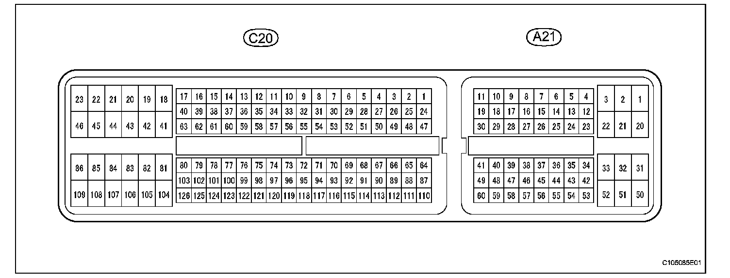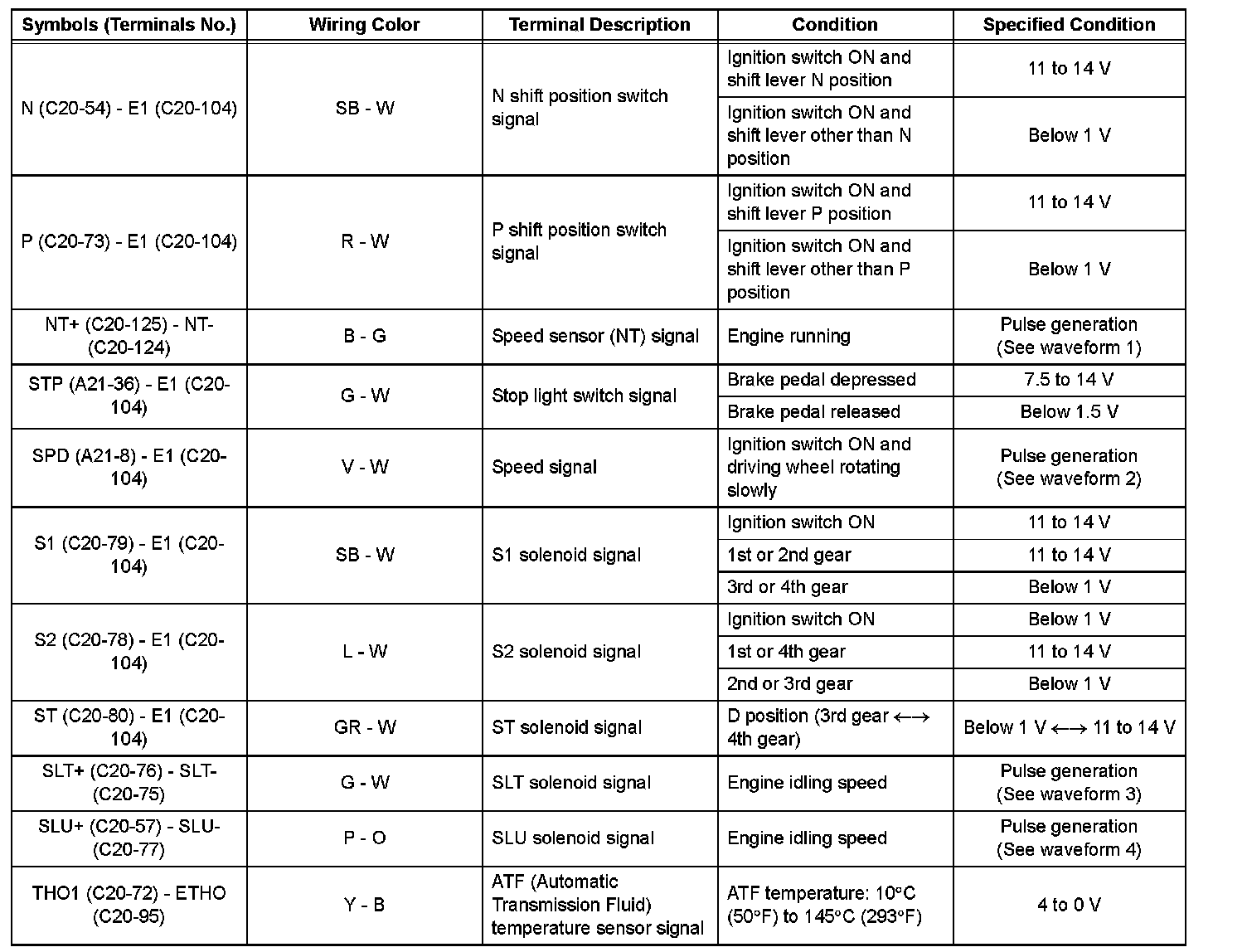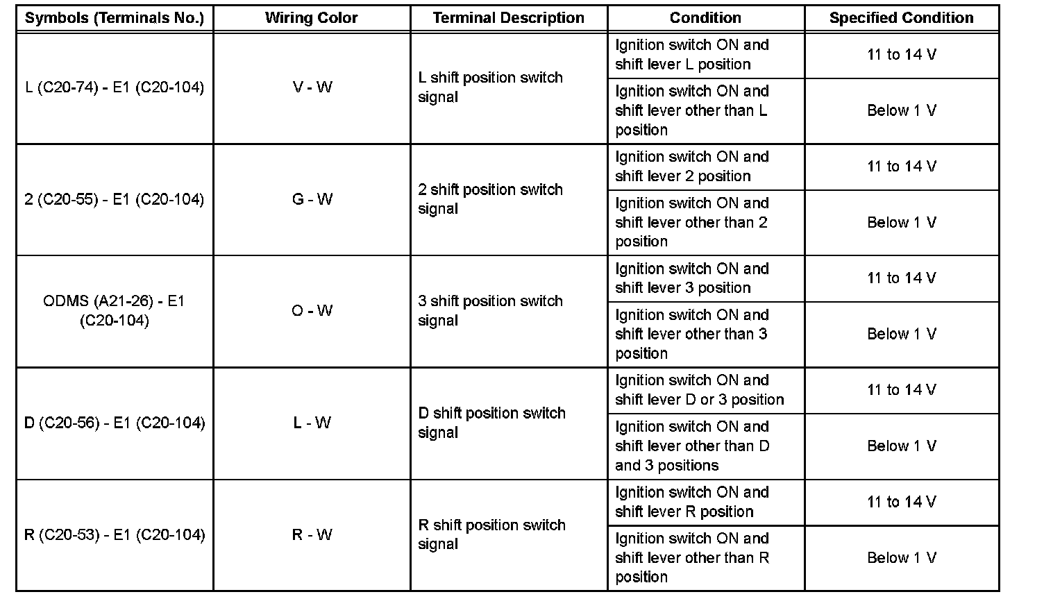 In the table, first follow the information under "Condition". Look under "Symbols (Terminal No.)" for the terminals to be inspected. The standard voltage between the terminals is shown under "Specific Condition".