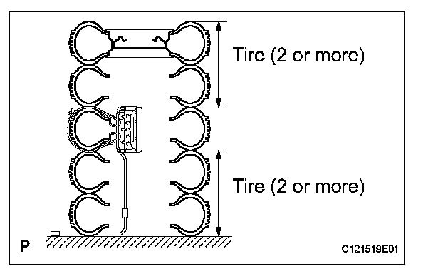 2. Place at least 2 tires over the tire to which the front passenger airbag is tied. The disc wheel should be installed onto the top tire.