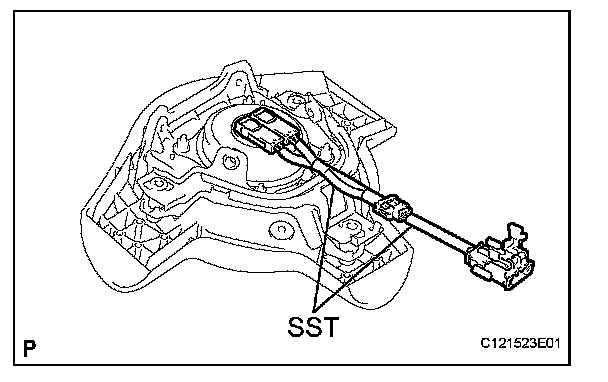 4. Face the airbag deployment side of the steering pad upward. Using wire harnesses separately tie the left and right sides of the steering pad to the disc wheel through the hub nut holes. Position the SST connector so that it hangs downward through the hub hole in the disc wheel.