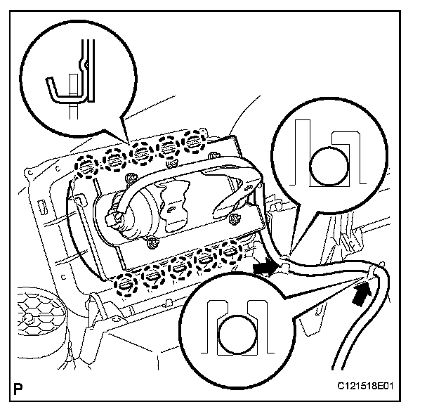 b. Install the wire harness onto the 2 claws of the instrument panel.