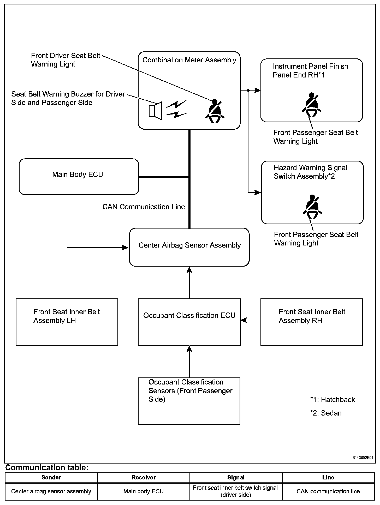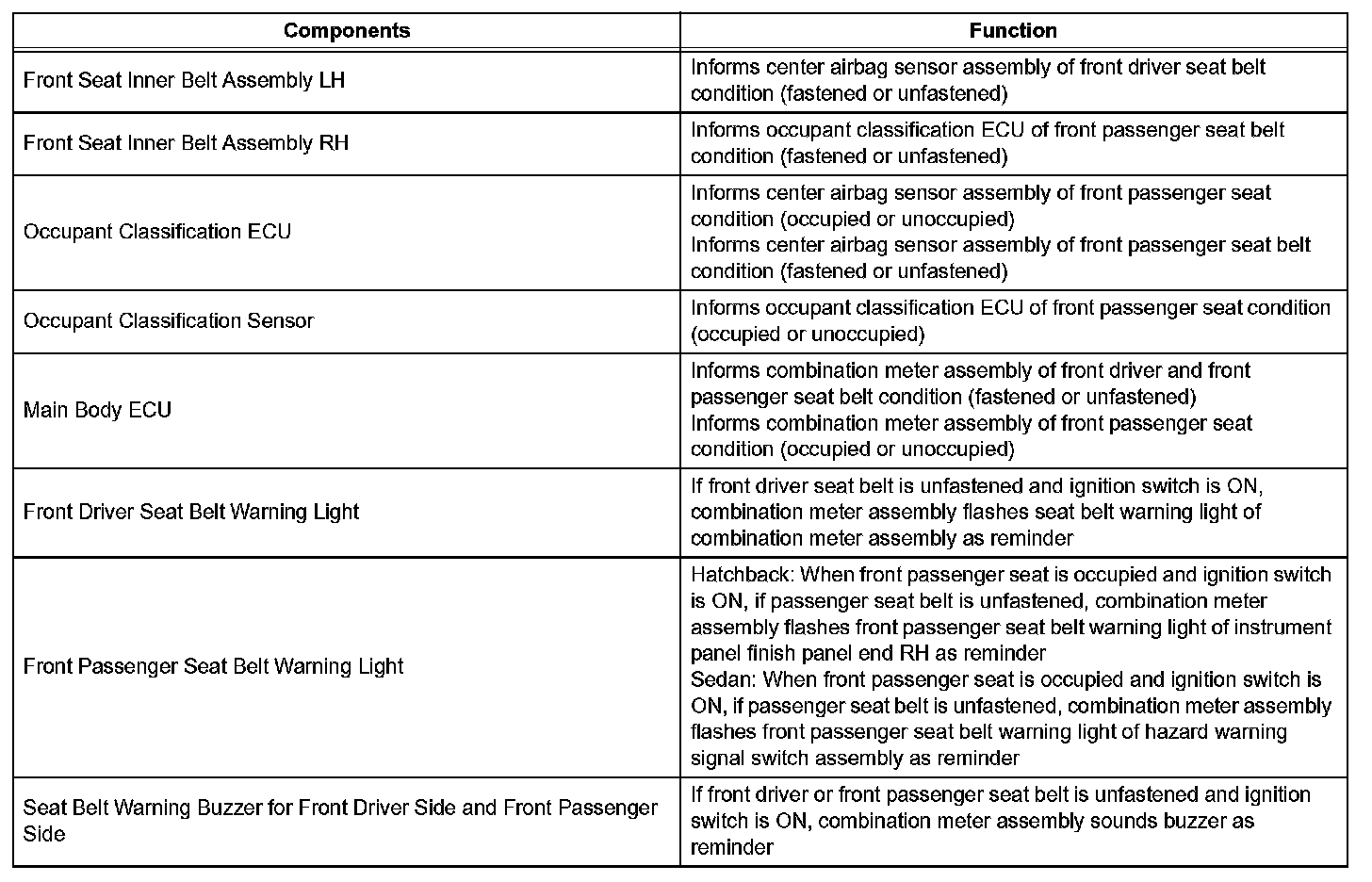 - When the ignition switch is ON, this system detects the condition of the seat belts based on signals from the front seat inner belt switches (for driver and front passenger seats) and the occupant classification sensor (front passenger side only).