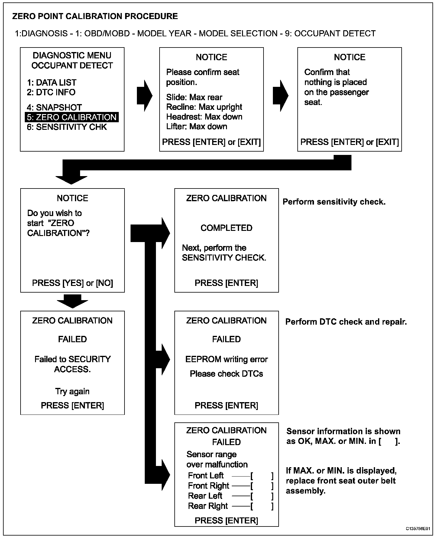 - If the zero point calibration has not finished normally replace the front seat assembly RH.