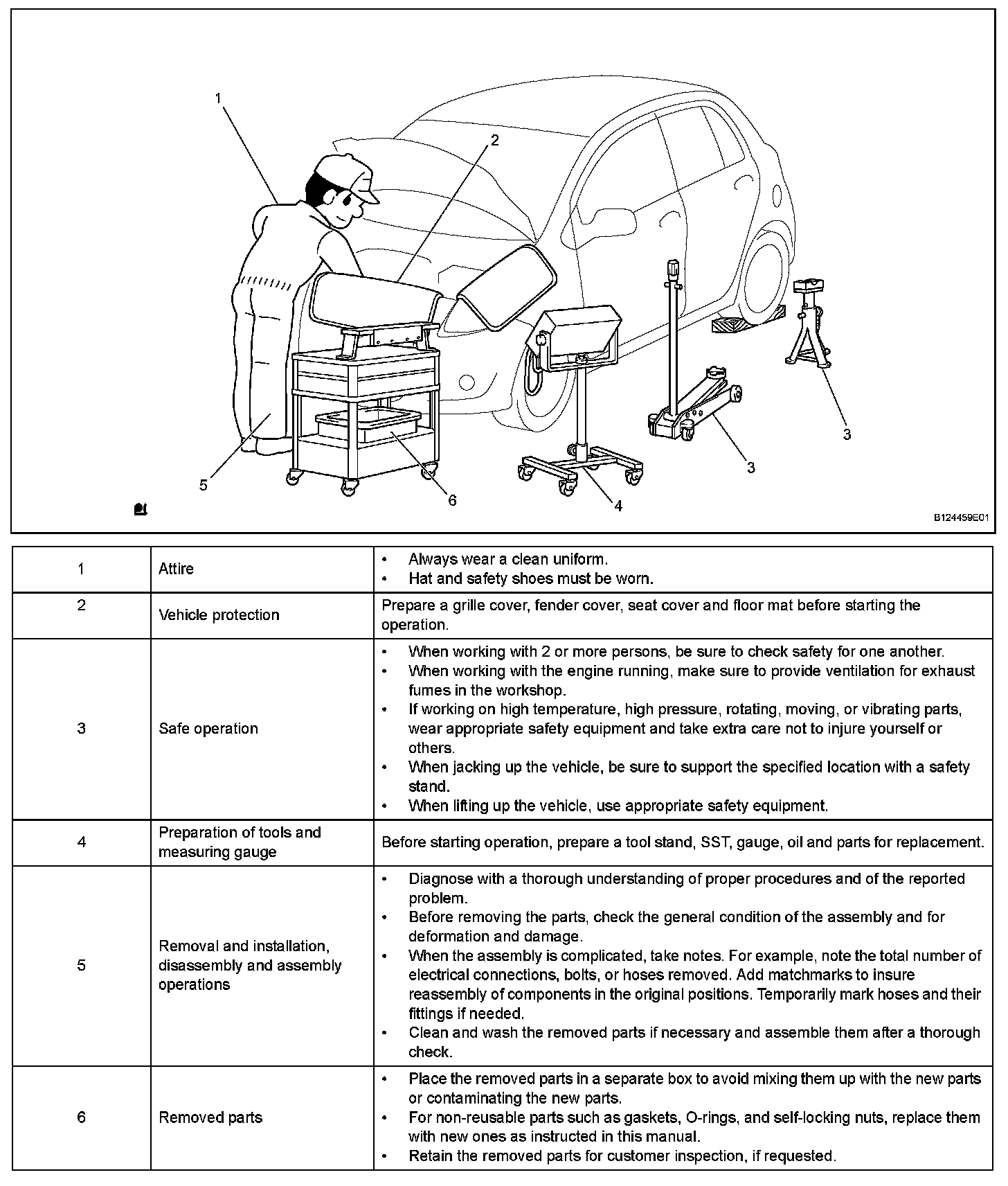 1. Care must be taken when jacking up and supporting the vehicle. Be sure to lift and support the vehicle at the proper locations.