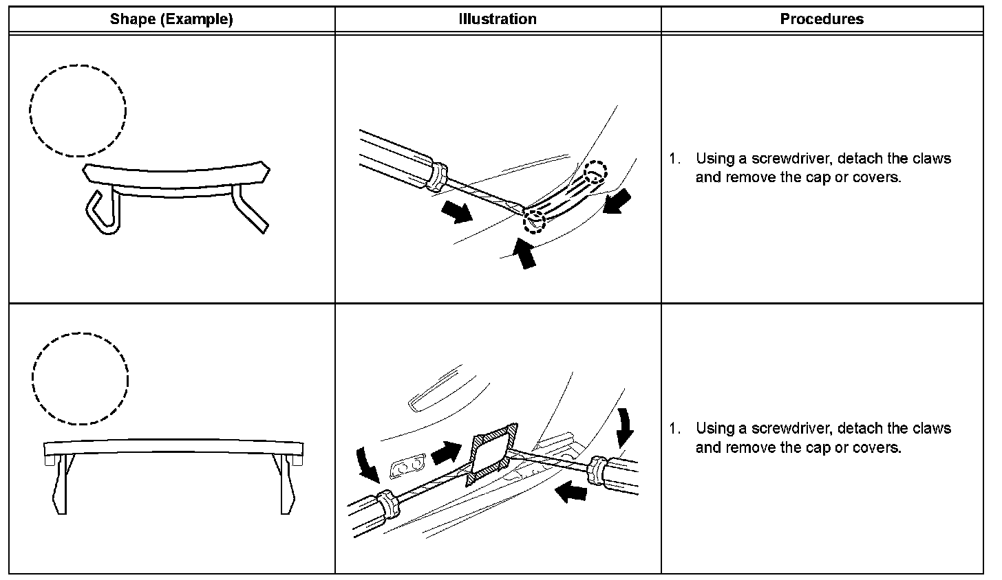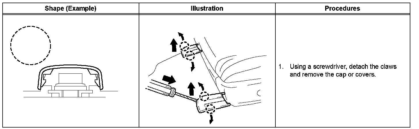 1. The removal and installation methods of typical clips used for vehicle body parts are shown in the table.