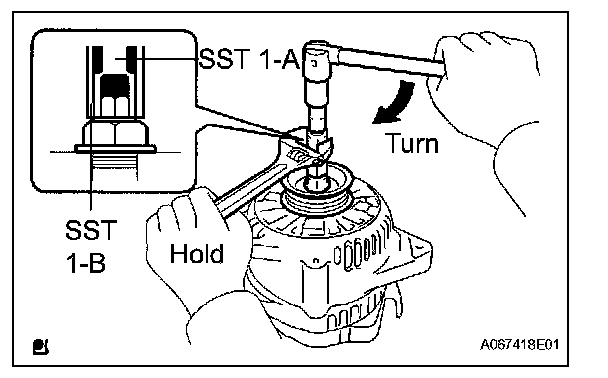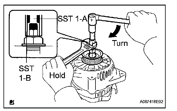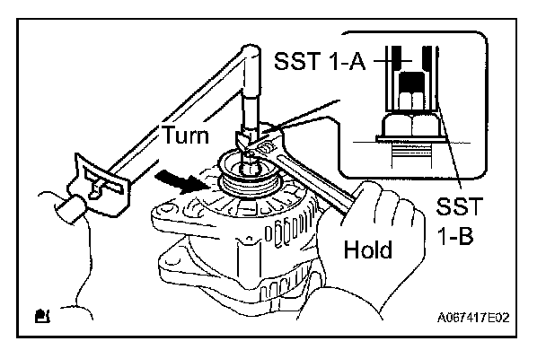 d. To loosen the generator pulley nut, turn SST 1-A in the direction shown in the illustration.