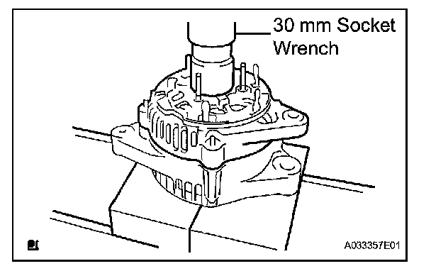 c. Using a 30 mm socket wrench and press, slowly press in the generator rectifier end frame.