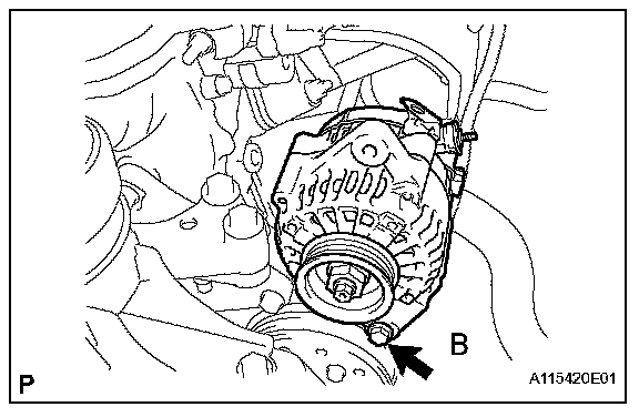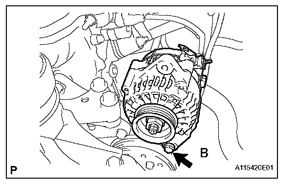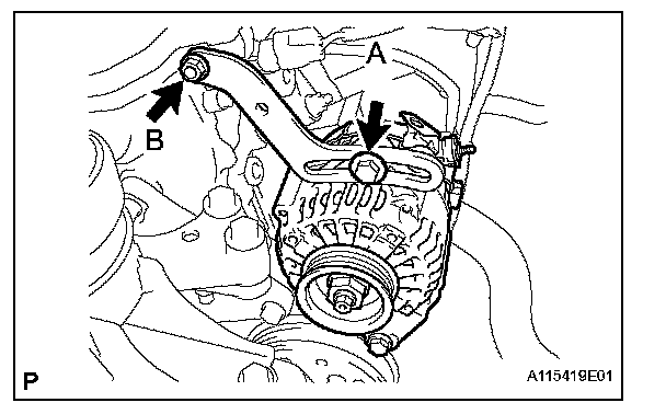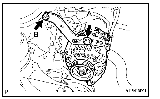 b. Provisionally install the fan belt adjusting slider with fan belt adjusting slider fixing bolts A and B, then move the generator toward the cylinder block and tighten bolt B.