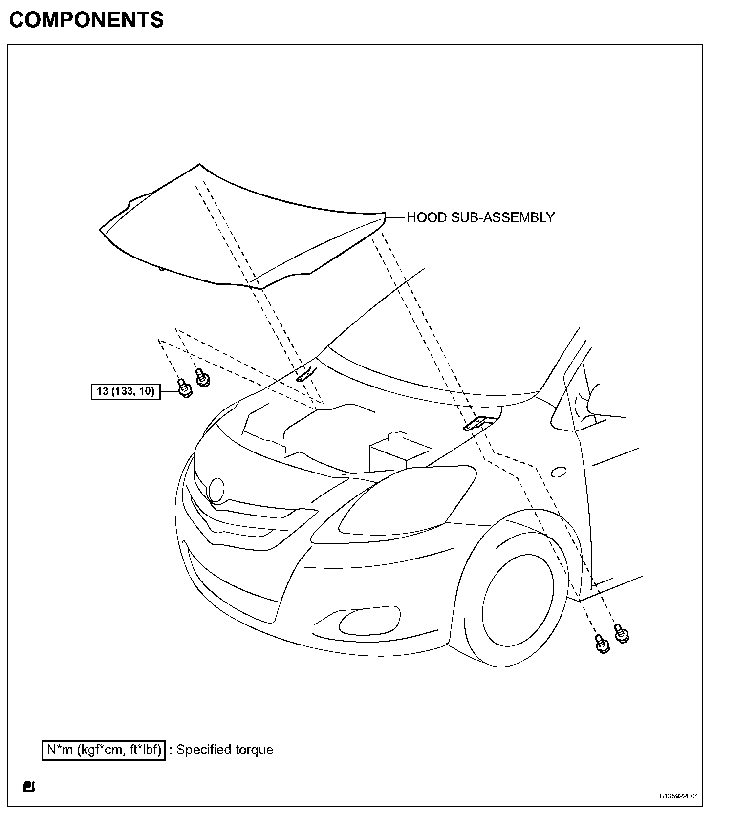 HINT: Tighten the bolts to the specified torque after inspecting the hood.