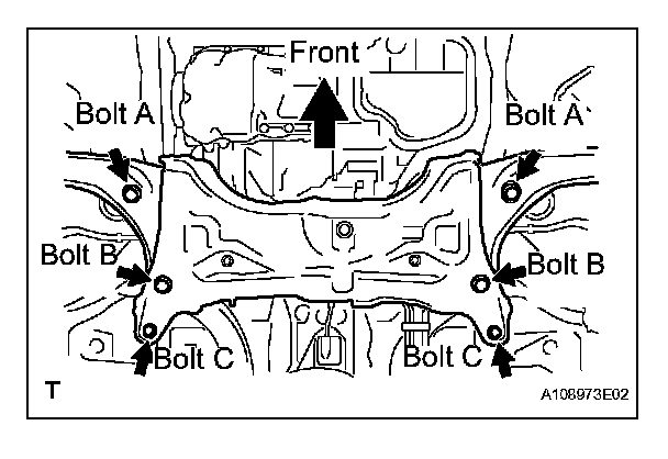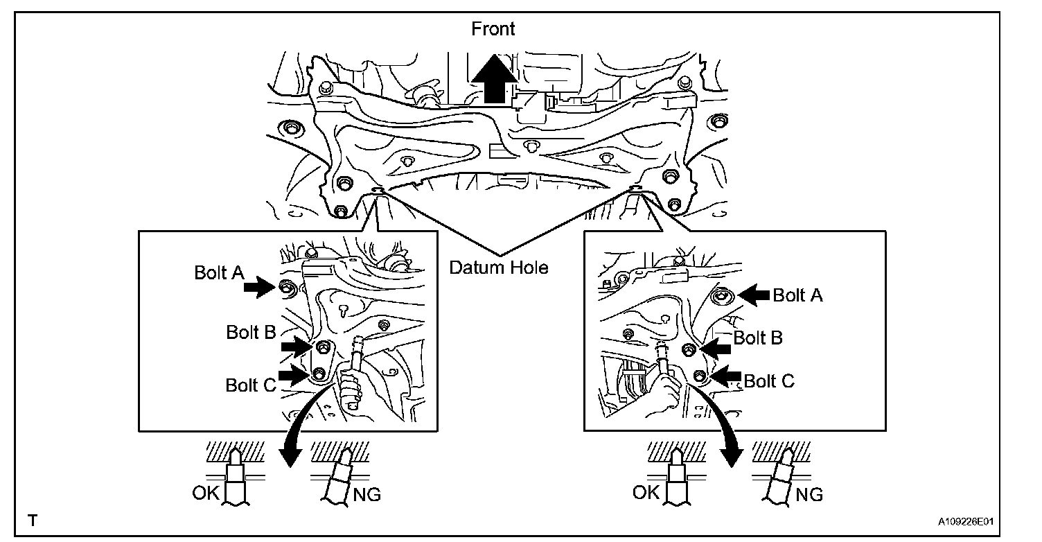 (c) By inserting SST into the datum holes in the front suspension crossmembers RH and LH alternately, tighten bolts A, B and C on both sides to the specified torque, in several steps.