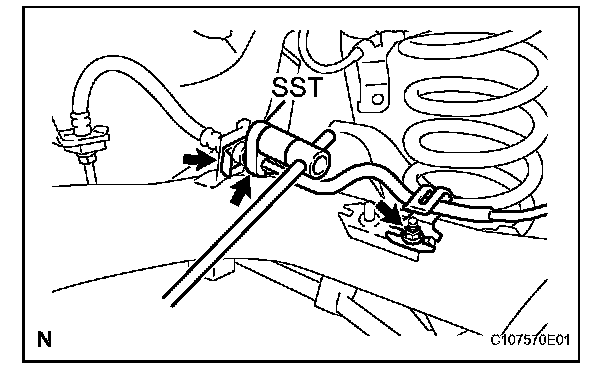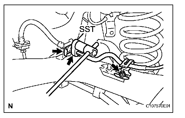 (b) Remove the clip and disconnect the flexible hose from the axle beam.