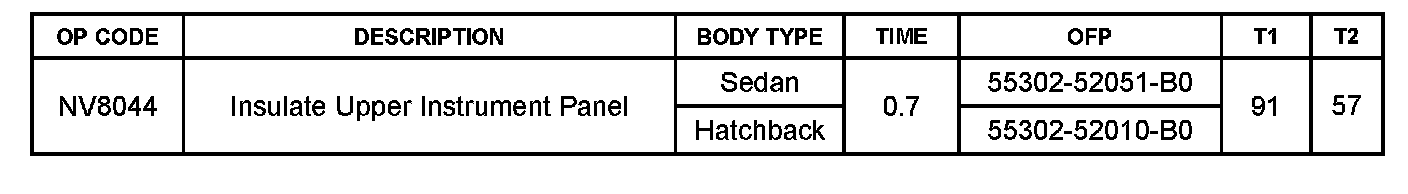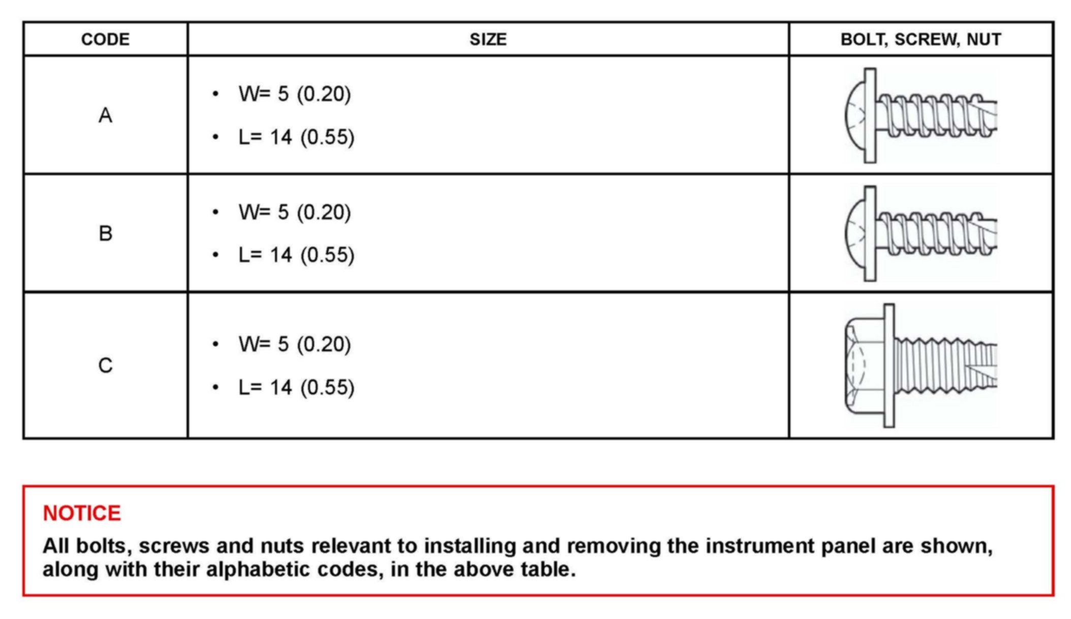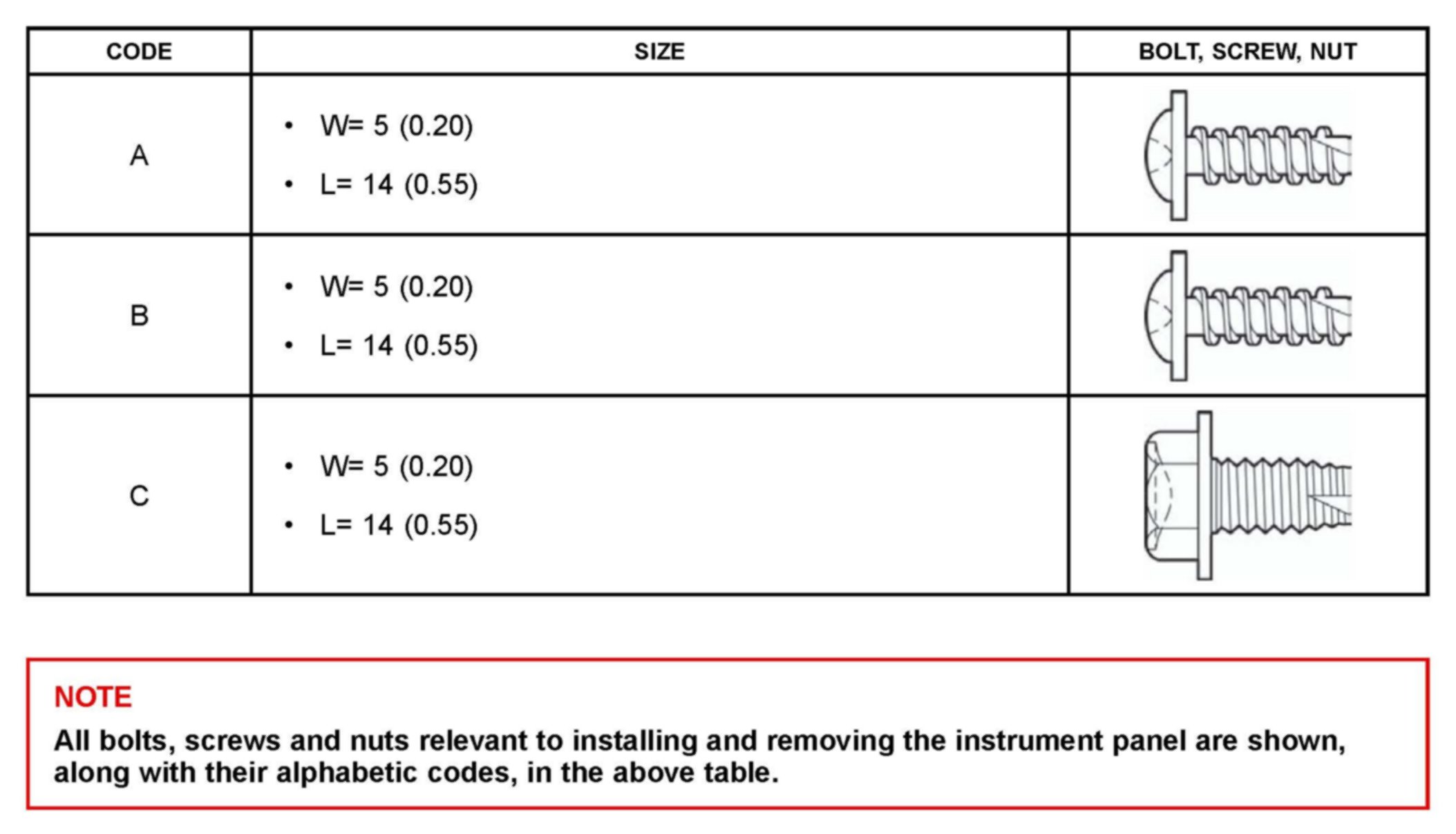 All bolts, screws and nuts relevant to installing and removing the instrument panel are shown, along with their alphabetic codes, in the above table.