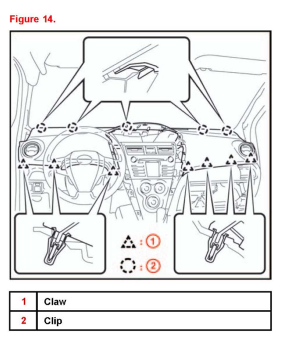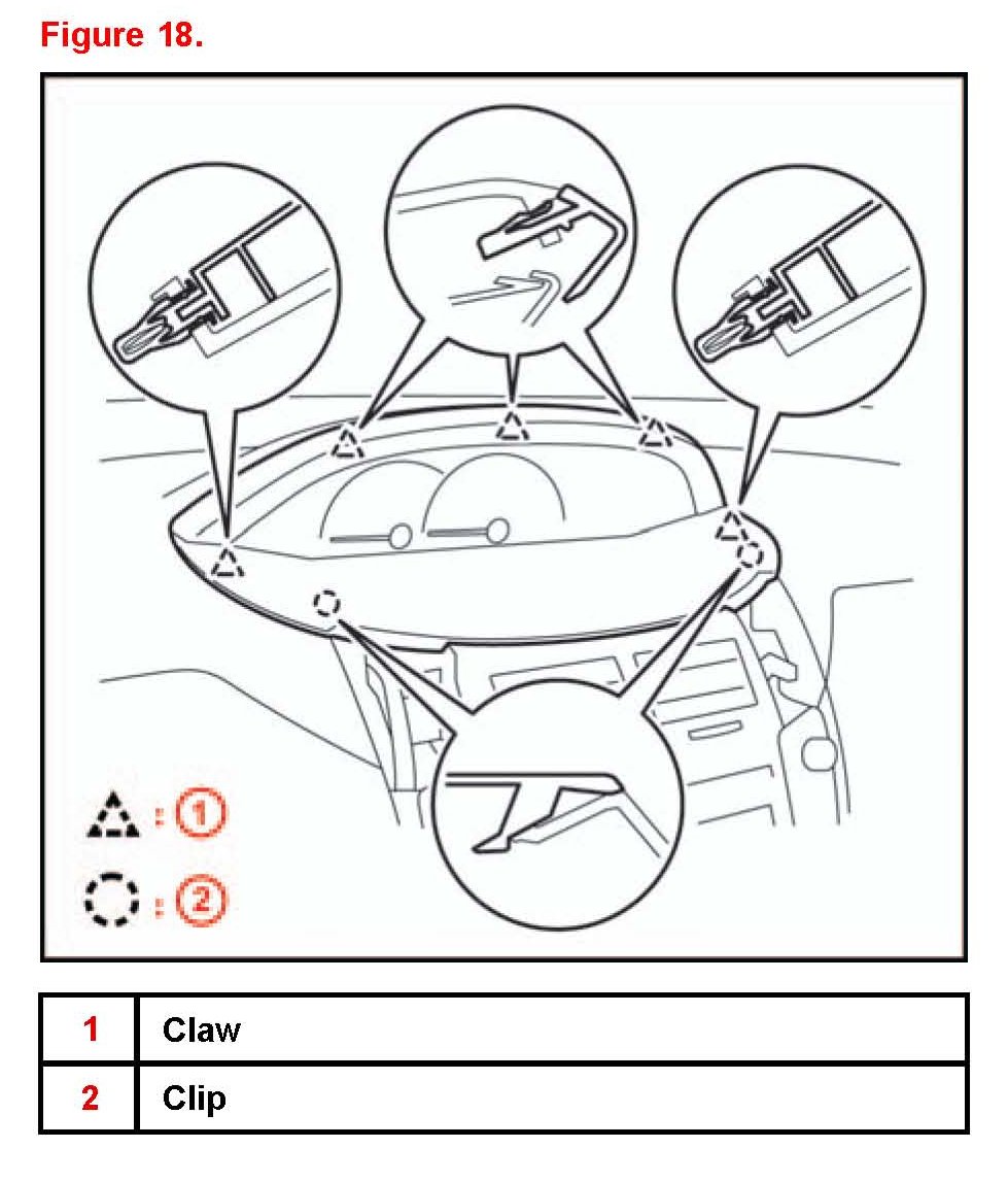 E. Disengage the claw and 3 clips while lifting the instrument panel up. Slide the instrument panel toward the rear of the vehicle to disengage the 5 claws at the front of the instrument panel.