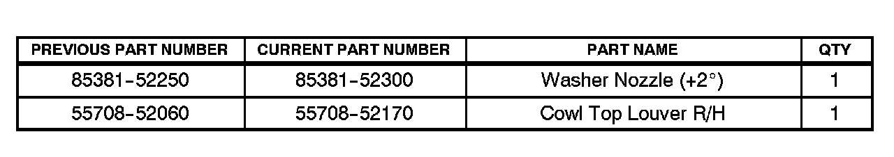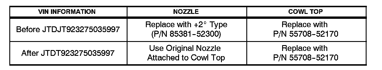 To enhance the windshield wiper/washer performance, Toyota has introduced a new type of washer nozzle and cowl top cover with improved nozzle location.