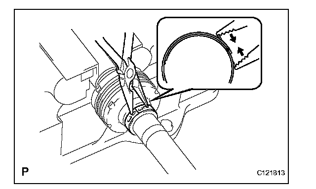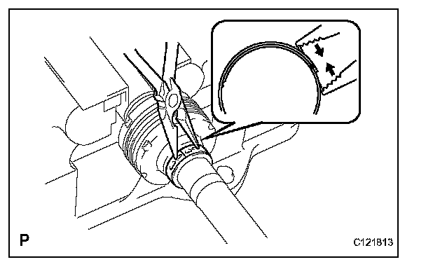 ^ Face the cut area of the front drive inboard joint hole snap ring downward.