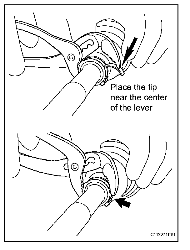 (b) Using water pump pliers, pinch the boot clamp to provisionally fix it.