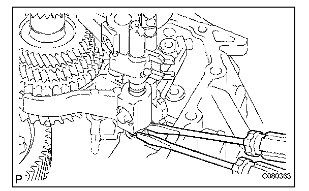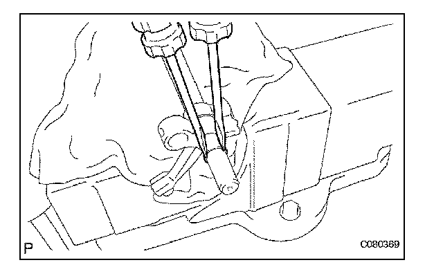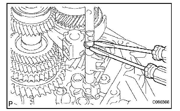 (a) Using 2 screwdrivers and a hammer, tap out the snap ring from gear shift fork shaft No. 2.