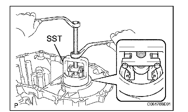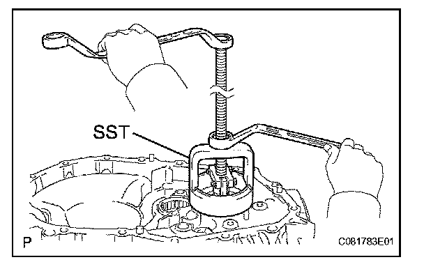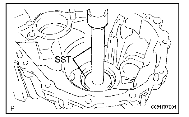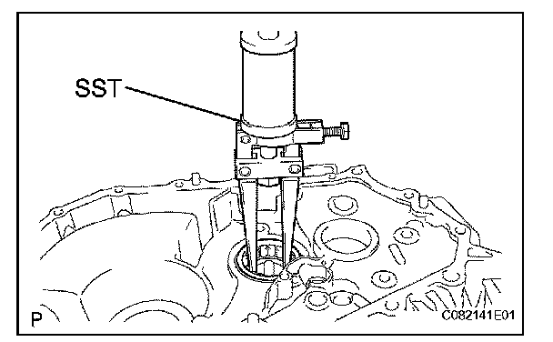 (a) Using SST, remove the front differential case rear tapered roller bearing (outer race) and plate washer from the transmission case.