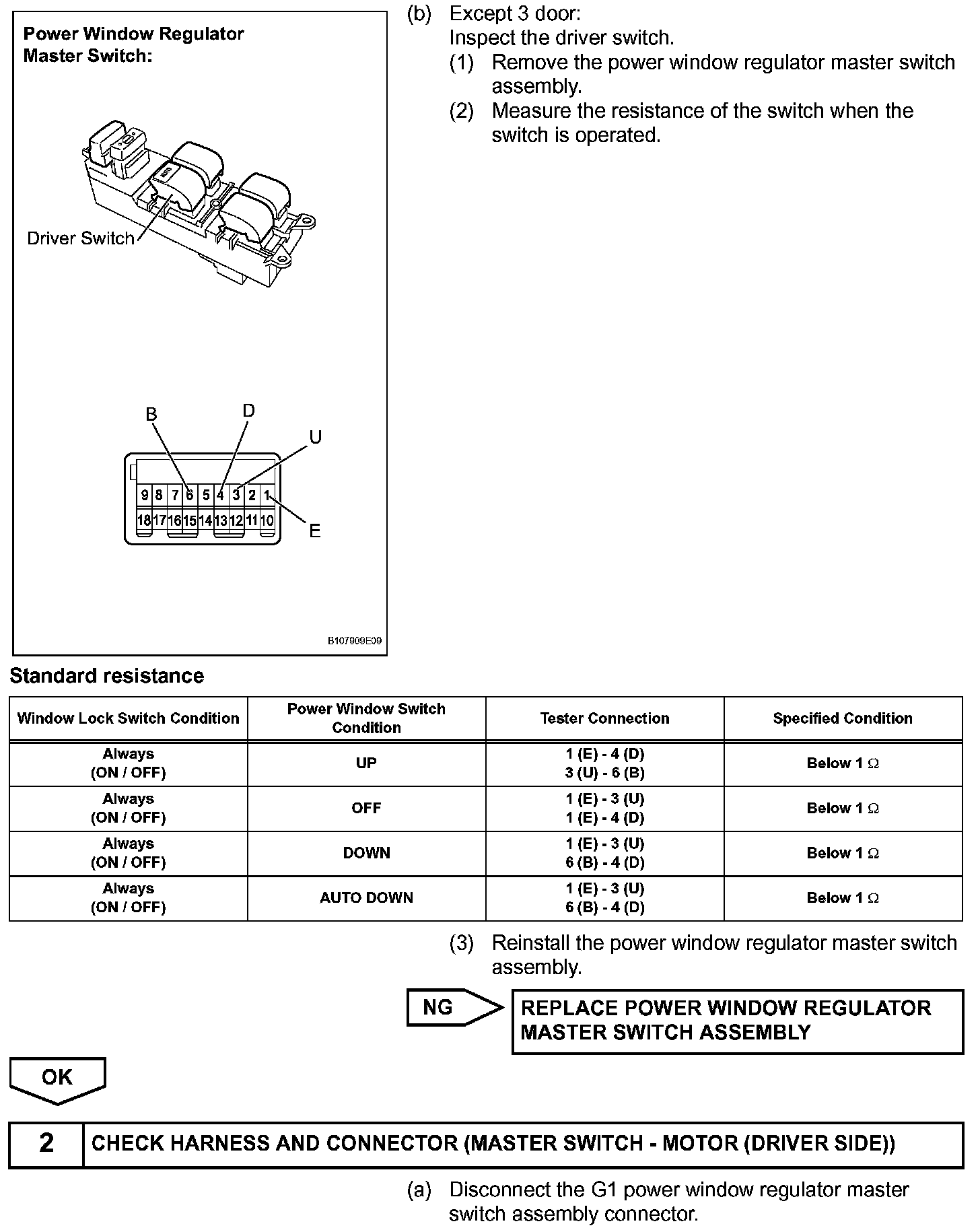 If the manual UP / DOWN and AUTO DOWN functions do not operate, a malfunction may exist in the power window regulator master switch, power window regulator motor or wire harness.