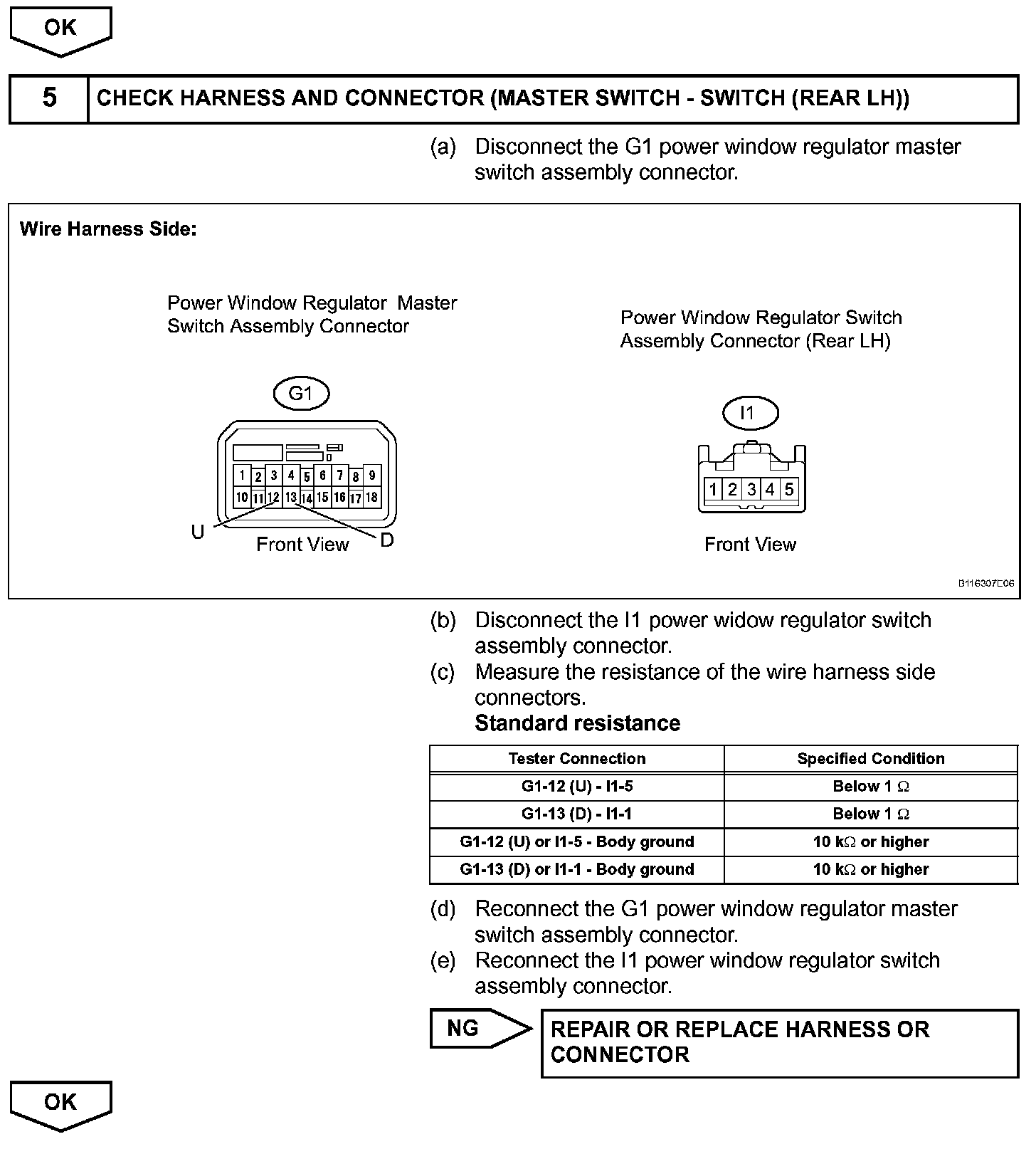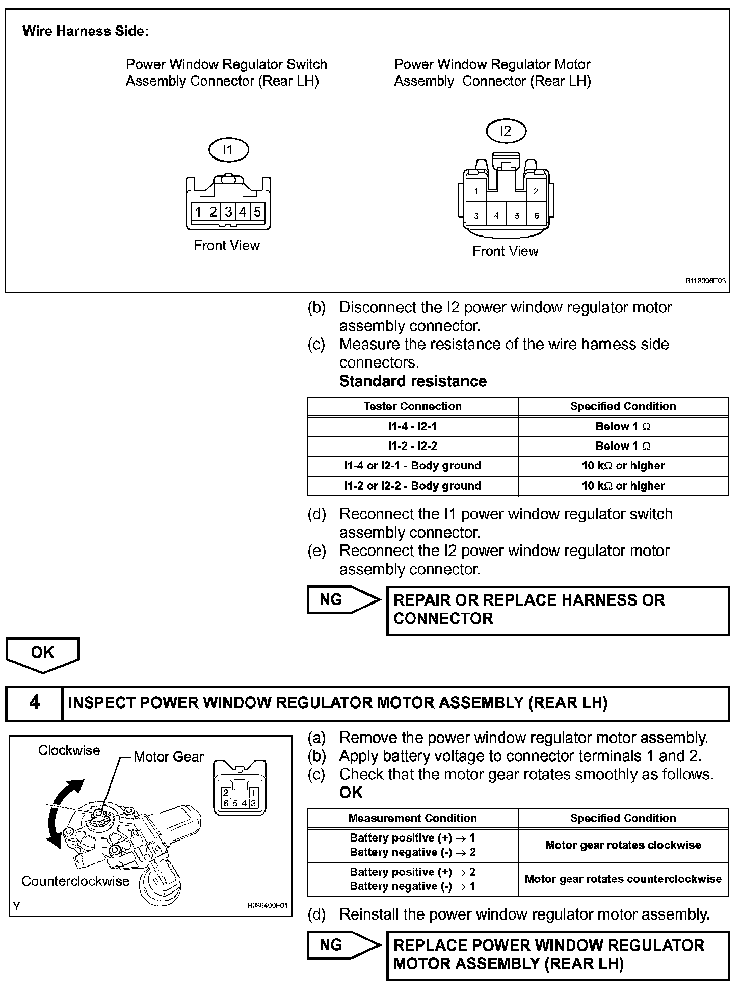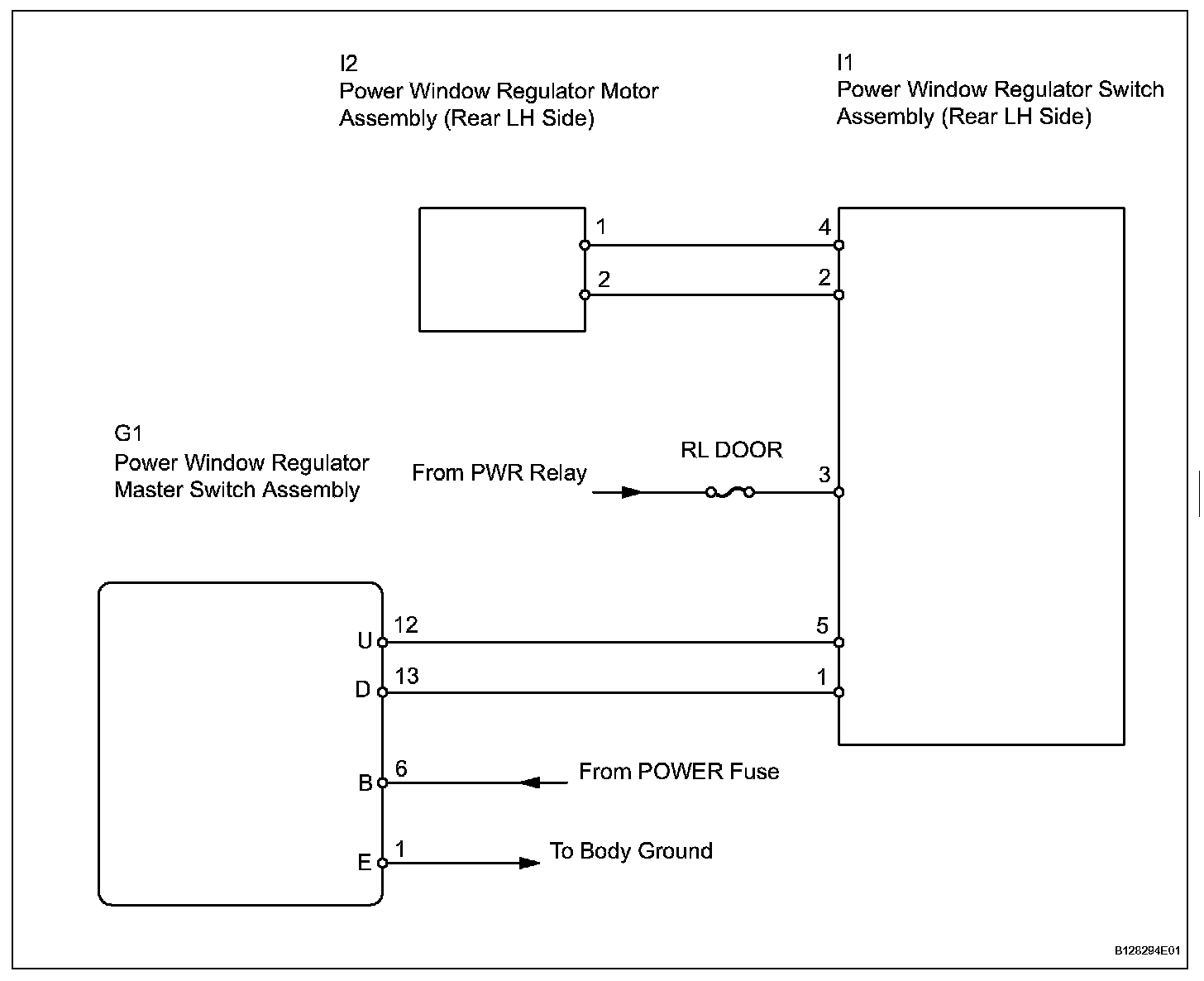 If the rear LH side manual UP / DOWN function does not operate, a malfunction may exist in the power window regulator motor, power window regulator switch, power window regulator master switch or wire harness.