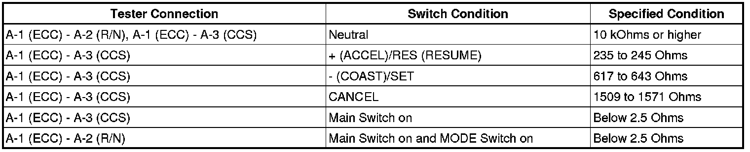 The cruise control main switch operates 8 functions: SET, COAST, TAP-DOWN, RESUME, ACCEL, TAP-UP, CANCEL and MODE. The SET, TAP-DOWN and COAST functions, and the RESUME, TAP-UP and ACCEL functions are operated with the same switch. The cruise control main switch is an automatic return type switch which turns on only while operating it in each arrow direction and turns off after releasing it. The internal contact point of the cruise control main switch is turned on with the switch operation. The ECM then reads the resistance value that has been changed by the switch operation to control MODE, SET, COAST, RESUME, ACCEL and CANCEL. The dynamic laser cruise control system has two cruise control modes: the constant speed control mode and vehicle-to-vehicle distance control mode.