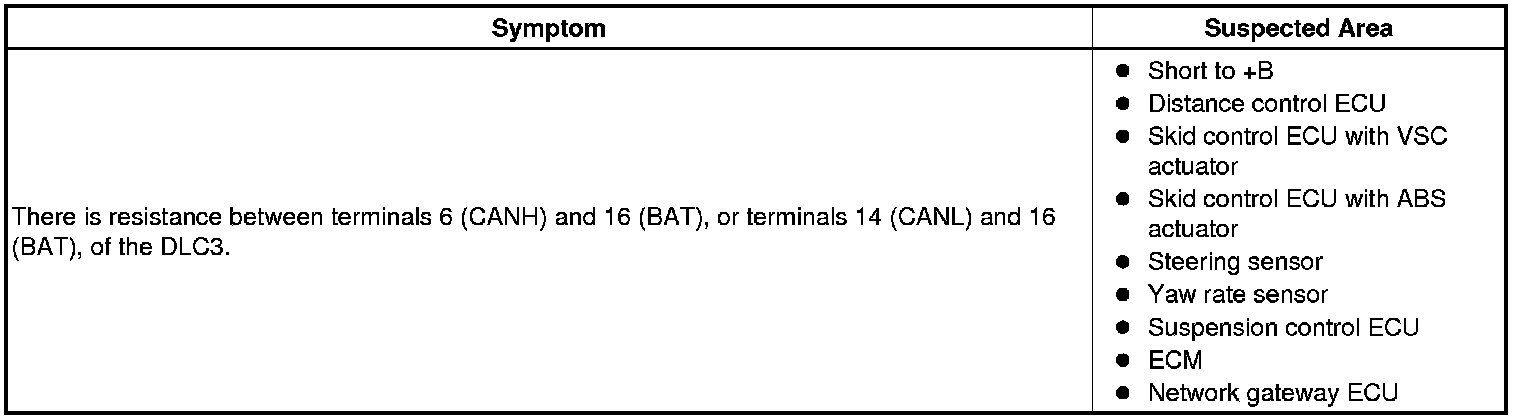 There may be a short circuit between the CAN bus line and +B when there is resistance between terminals 6 (CANH) and 16 (BAT), or terminals 14 (CANL) and 16 (BAT), of the DLC3.
