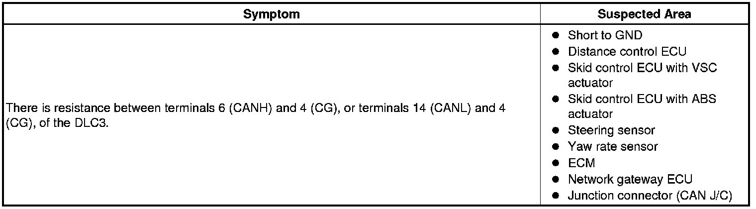 There may be a short circuit between the CAN bus line and GND when there is resistance between terminals 6 (CANH) and 4 (CG), or terminals 14 (CANL) and 4 (CG), of the DLC3.