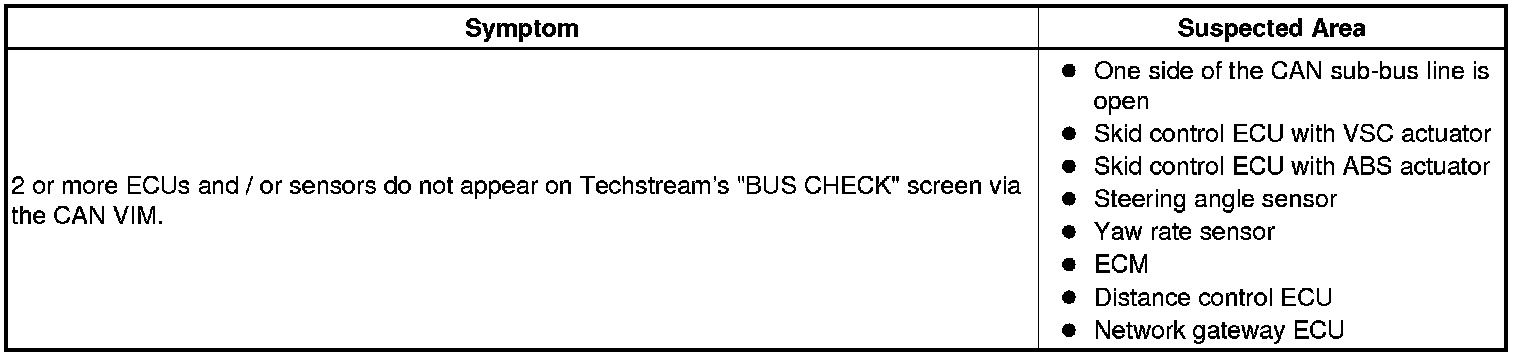 If 2 or more ECUs and / or sensors do not appear on Techstream "CAN Bus Check" screen, one side of the CAN sub-bus line may be open. (One side of the CAN-H [sub-bus line] / CAN-L [sub-bus line] of the ECU and / or sensor is open.)
