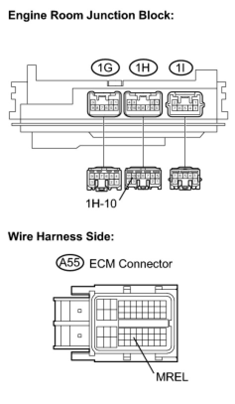 When the ignition switch is turned on (IG), voltage from the ECM's MREL terminal applies to the engine room junction block (EFI relay). This causes the contacts of the engine room junction block (EFI relay) to close, which supplies power to terminal +B or +B1 of the ECM.