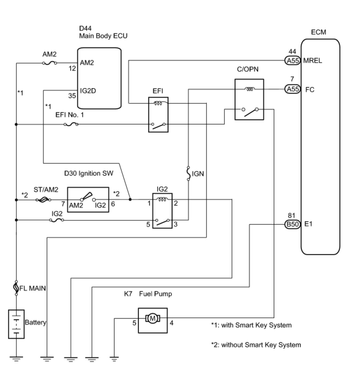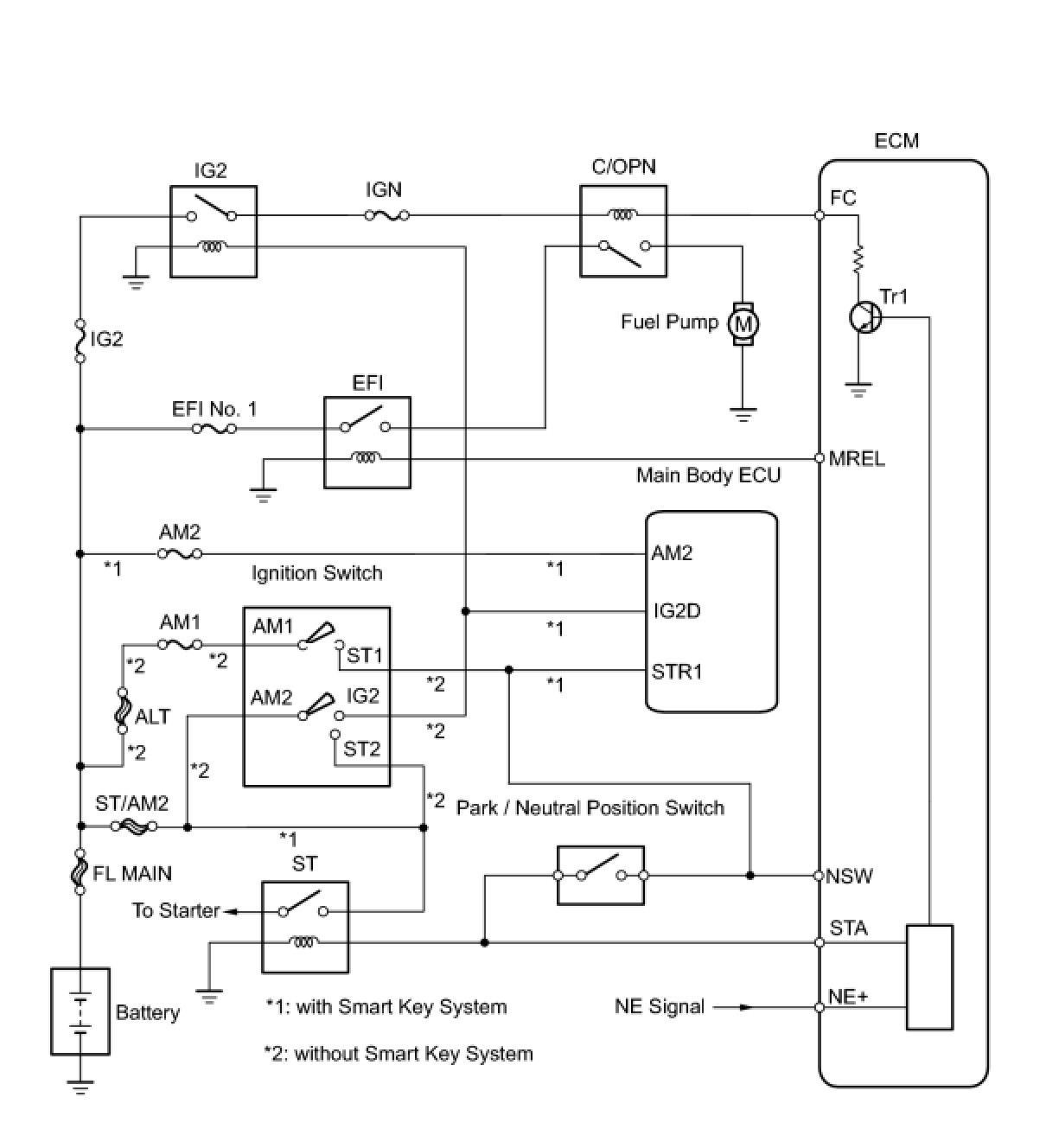 When the STA signal and NE signal are input to the ECM, Tr is turned ON, current flows to the coil of the circuit opening relay (Marking: C/OPN), the relay switches on, power is supplied to the fuel pump and the fuel pump operates.