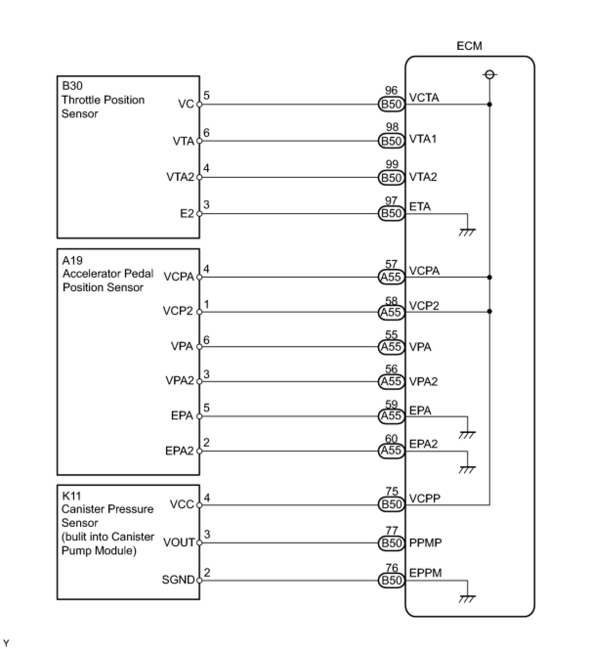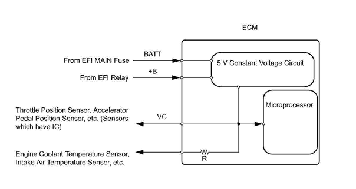The ECM constantly uses 5 V from the battery voltages supplied to the +B (BATT) terminal to operate the microprocessor. The ECM also provides this power to the sensors through the VC output circuit.