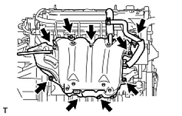 (e) Remove the 5 bolts, 2 nuts and intake manifold.