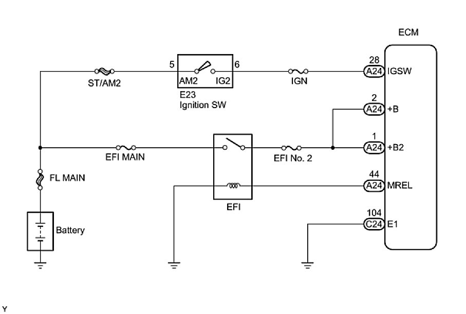 When the ignition switch is turned ON position, the battery voltage is applied to IGSW of the ECM. The output signal from the MREL terminal of the ECM causes a current to flow to the coil, closing the contacts of the engine room J/B (EFI relay) and supplying power to either terminal +B or +B2 of the ECM.