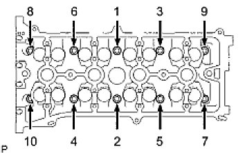 - Using several steps, uniformly install and tighten the 10 cylinder head set bolts and plate washers with a 10 mm bi-hexagon wrench in the order shown in the illustration.