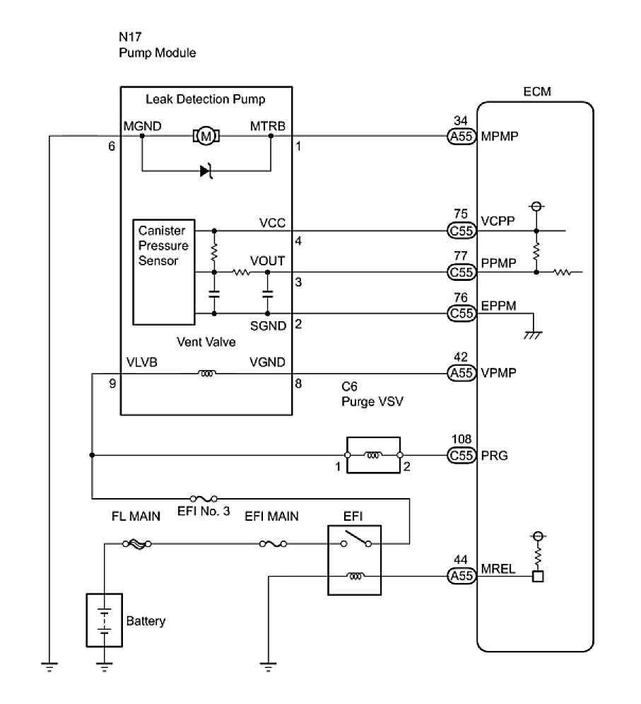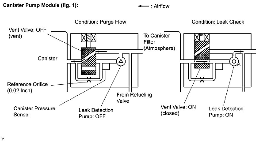 The leak detection pump creates negative pressure (vacuum) in the EVAP system and the pressure is measured. Finally, the ECM monitors for leaks from the EVAP system, and malfunctions in both the canister pump module and purge VSV, based on the EVAP pressure.