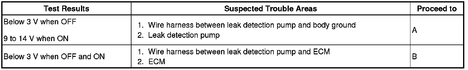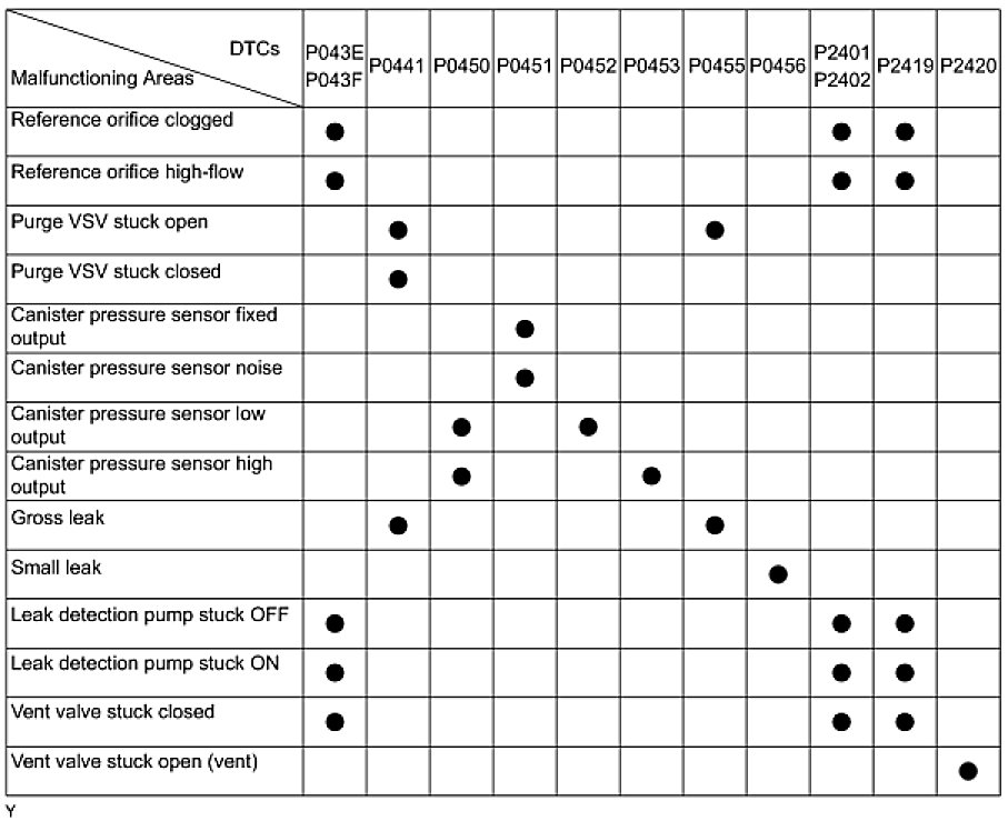 If any EVAP system DTCs are set, the malfunctioning area can be determined using the table below.