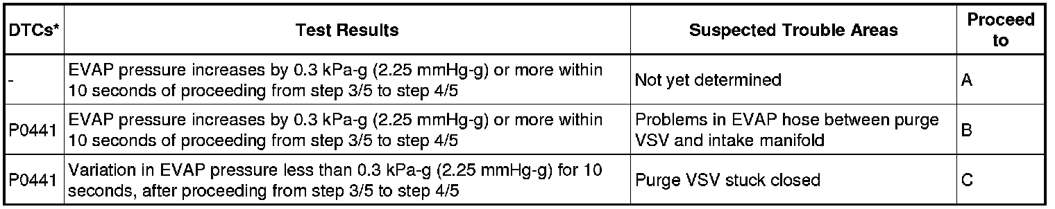 The vent valve is turned OFF (open) and the EVAP pressure is measured. If the variation in the pressure is less than 0.5 kPa-g (3.75 mmHg-g), the ECM interprets this as the purge VSV being stuck closed, and illuminates the MIL and sets DTC P0441 (2 trip detection logic).