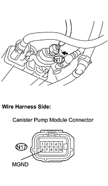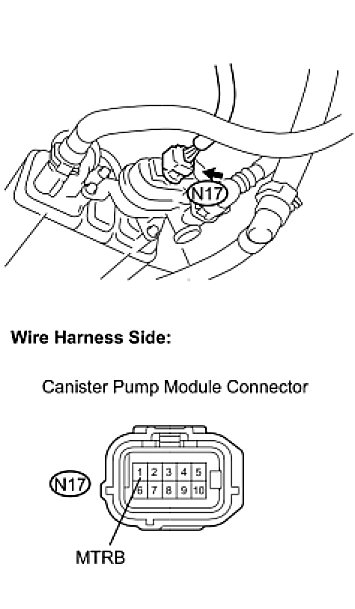 NOTE: When replacing the canister, check the canister pump module interior and related pipes for water, fuel and other liquids. If liquids are present, check for disconnections and/or cracks in the following: 1) the pipe from the air inlet port to the canister pump module; 2) the canister filter; and 3) the fuel tank vent hose.