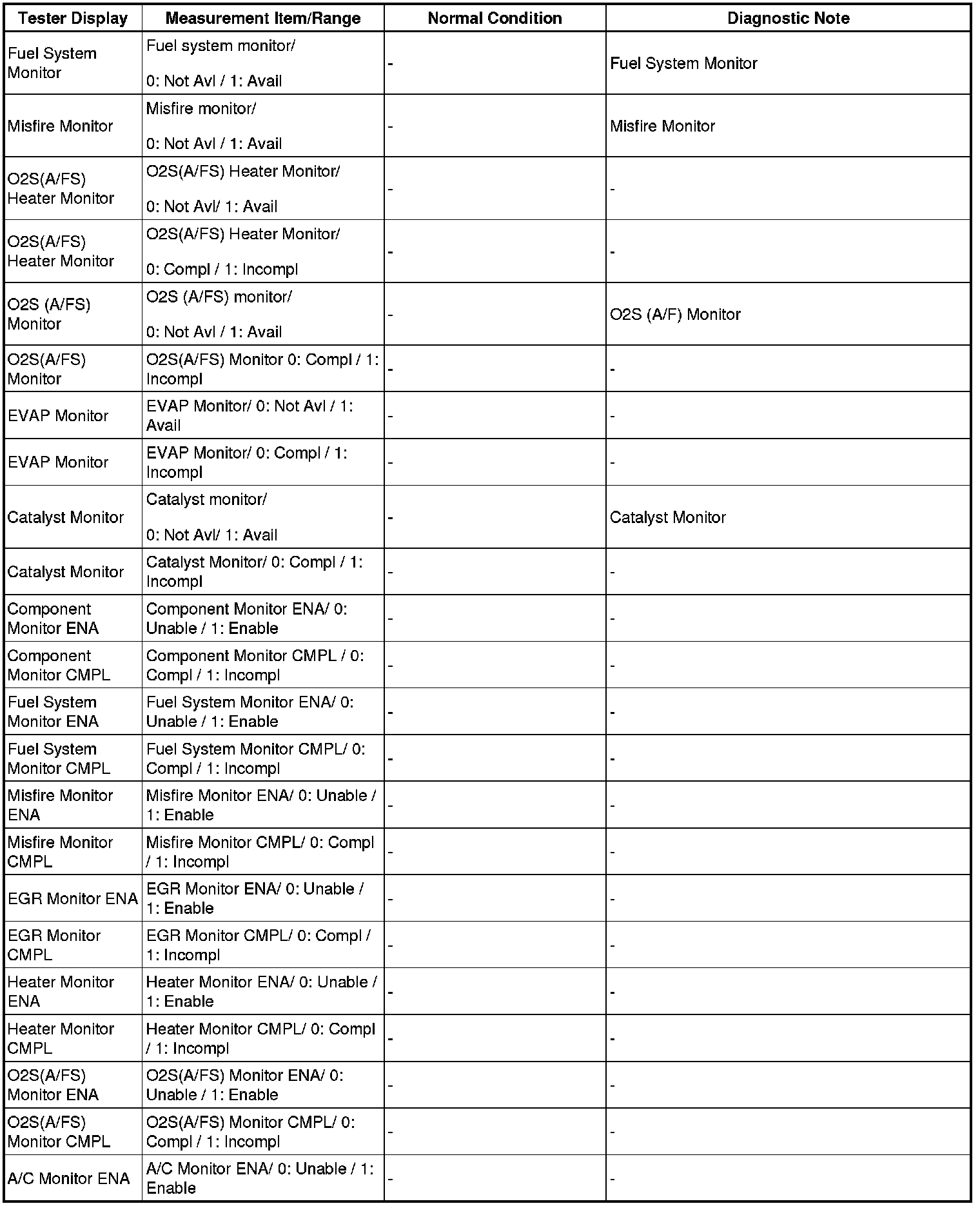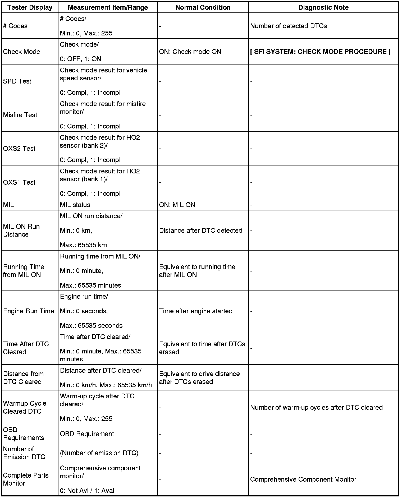 (e) Perform the System Check by referring to the table below.