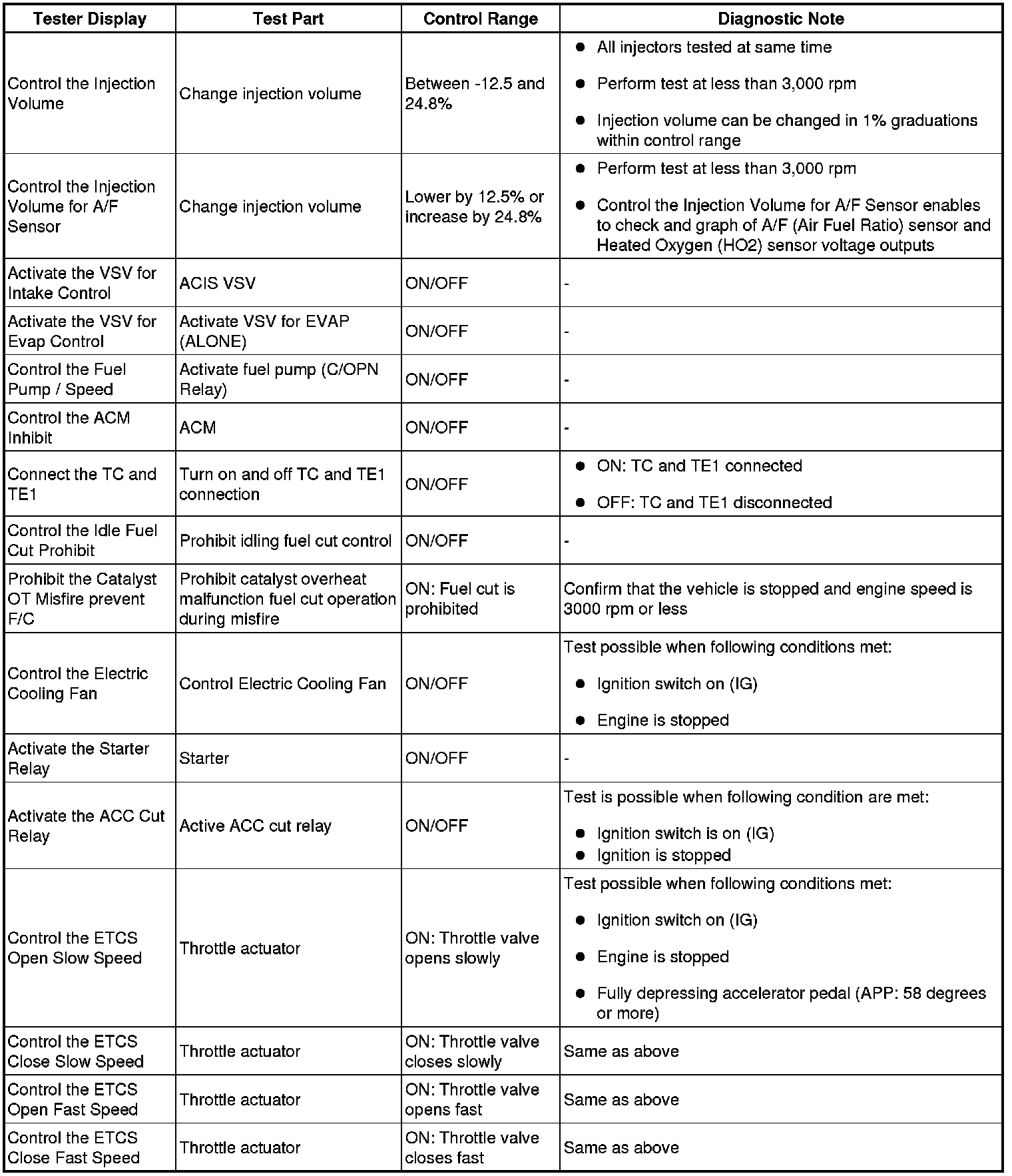 (e) Perform the Active Test by referring to the table below.
