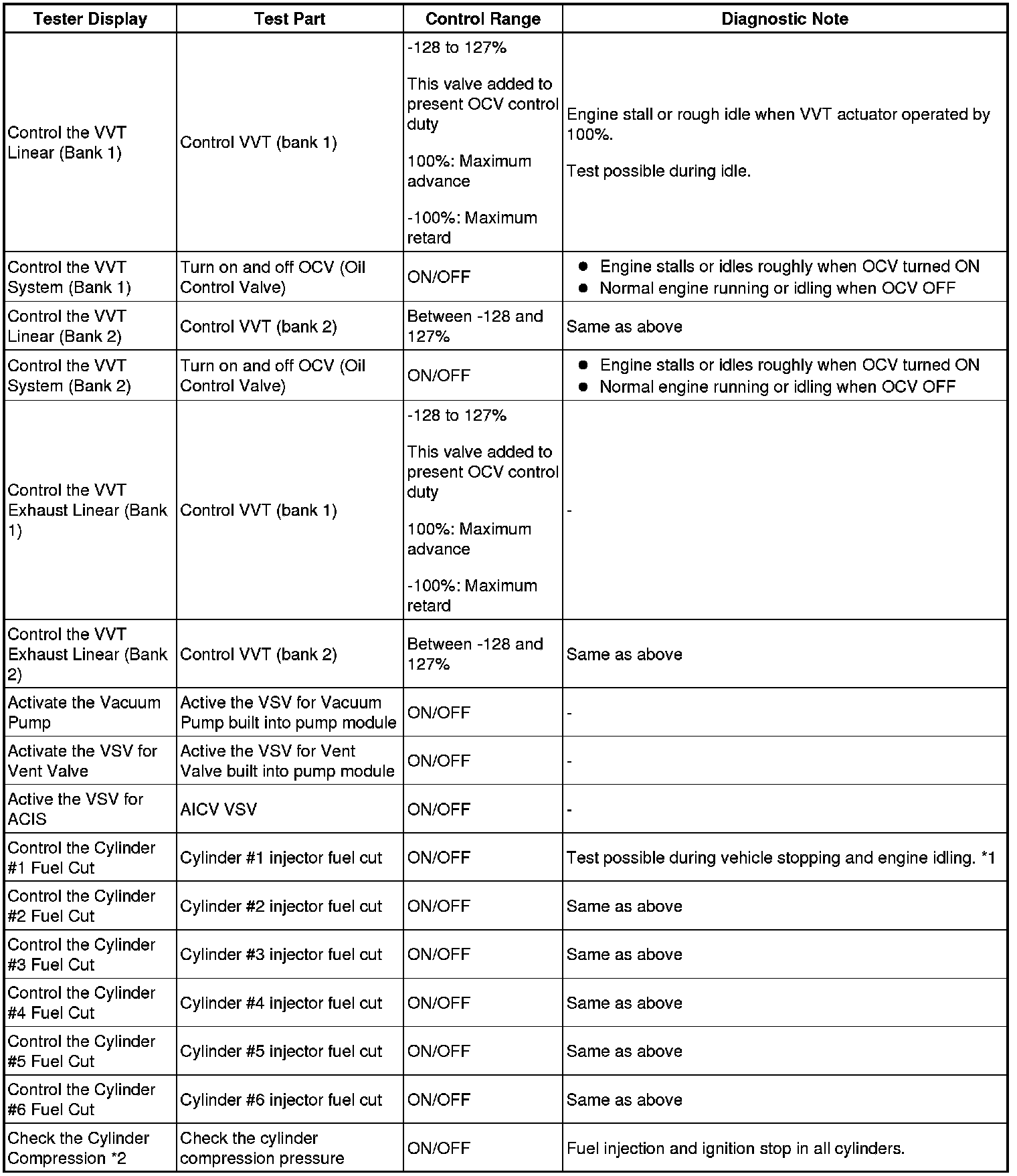 - *1: Data List values are displayed only when performing the following Active Test: Control the VVT Linear (Bank 1 or Bank 2) or Control the VVT Exhaust Linear (Bank 1 or Bank 2). For other Active Test, the Data List value will be 0.