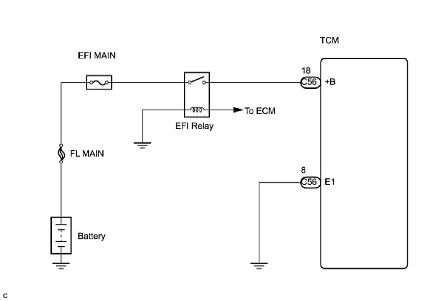 When the ignition switch is turned on (IG), voltage from the ECM's MREL terminal is applied to the EFI relay. This causes the contacts of the EFI relay to close, which supplies power to terminal +B of the TCM.