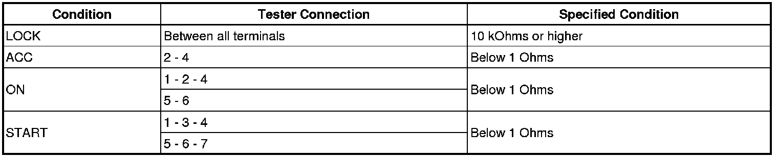 If the result is not as specified, replace the ignition or starter switch.