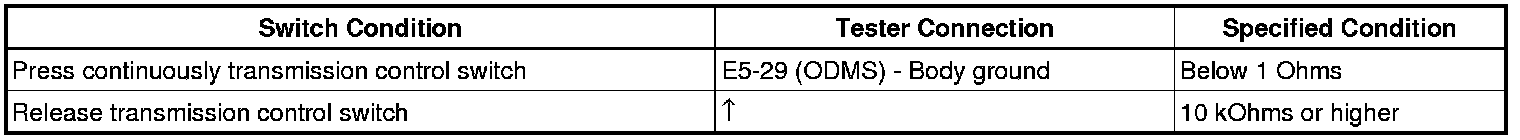 The O/D main switch (transmission control switch) is a momentary type switch. When pressing the O/D main switch, the O/D OFF indicator light lights up and the ECM prohibits shifting into O/D, and when pressing it once again, the O/D OFF indicator light goes off and the ECM allows shifting into O/D. Turning the IG switch OFF will reset the O/D OFF indicator light.