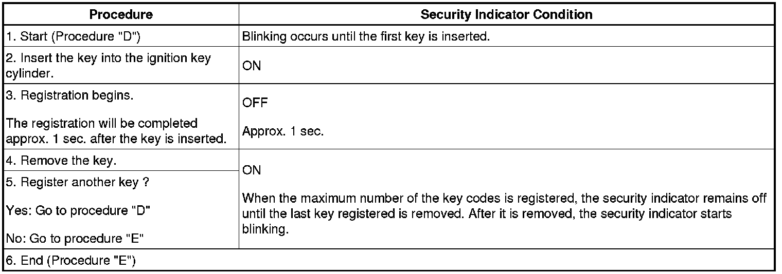 NOTE: If the key code registration has failed in automatic key code registration mode, code 2-1 will be output from the security indicator. Trying to register an already registered key will cause code 2-2 to be output when the key is inserted. If the number of registered key codes exceeds the limit, code 2-3 will be output from the security indicator. The output details are shown in procedure "B".