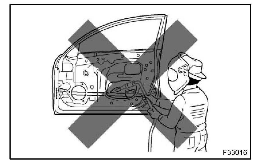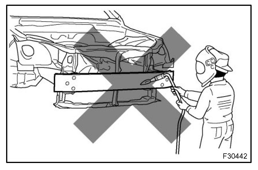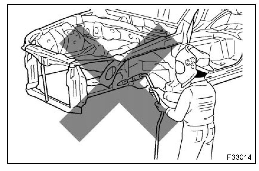 (1) Rustproof high strength steel sheets are used for the body frame. Therefore, if these parts are heat repaired using an acetylene torch or equivalent, the crystalline structure changes, causing the strength of the steel sheets to decrease.